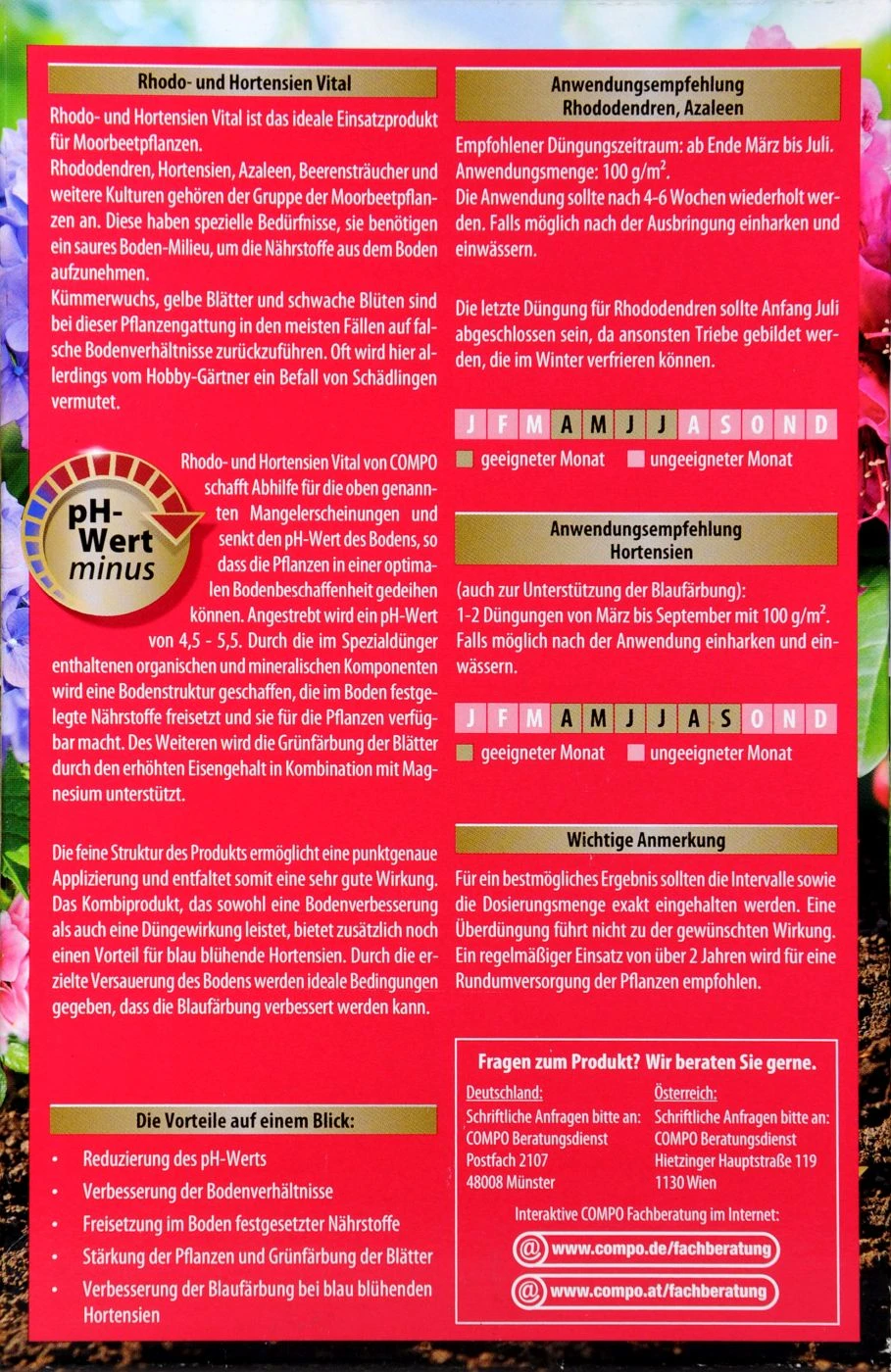 Die Moorbeetpflanzen lieben sauren Boden, den du mit dem Compo Spezialdünger Rhodo- und Hortensien Vital bekommst. Durch den Dünger werden die notwendigen Nährstoffe freigesetzt.