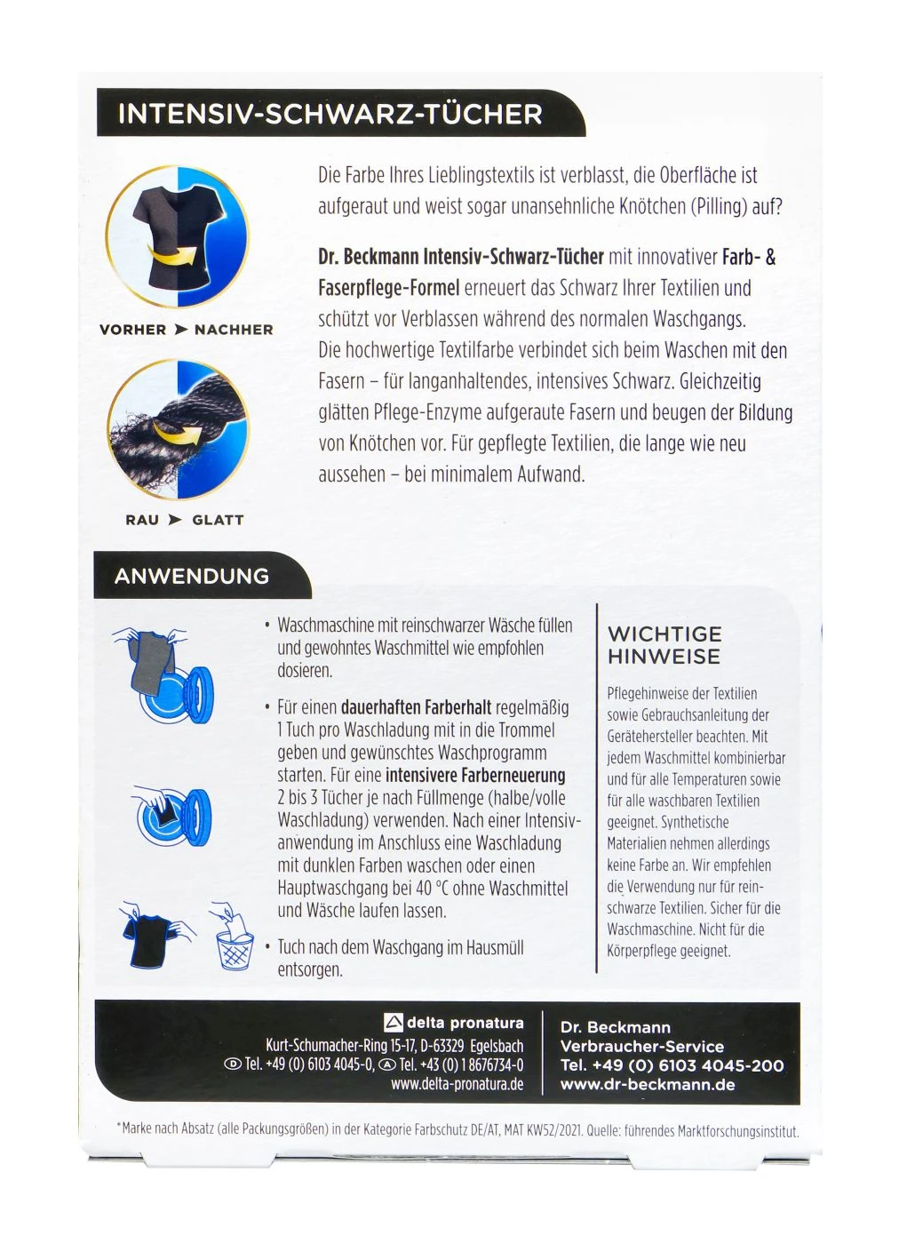 Dr. Beckmann Intensiv-Schwarz Tücher 2in1 sind ein Stoff-Pflegemittel. Während des Waschgangs erneuert die Farb- & Faserpflegeformel nachhaltig das Schwarz der Textilien und glättet gleichzeitig aufgeraute Fasern.