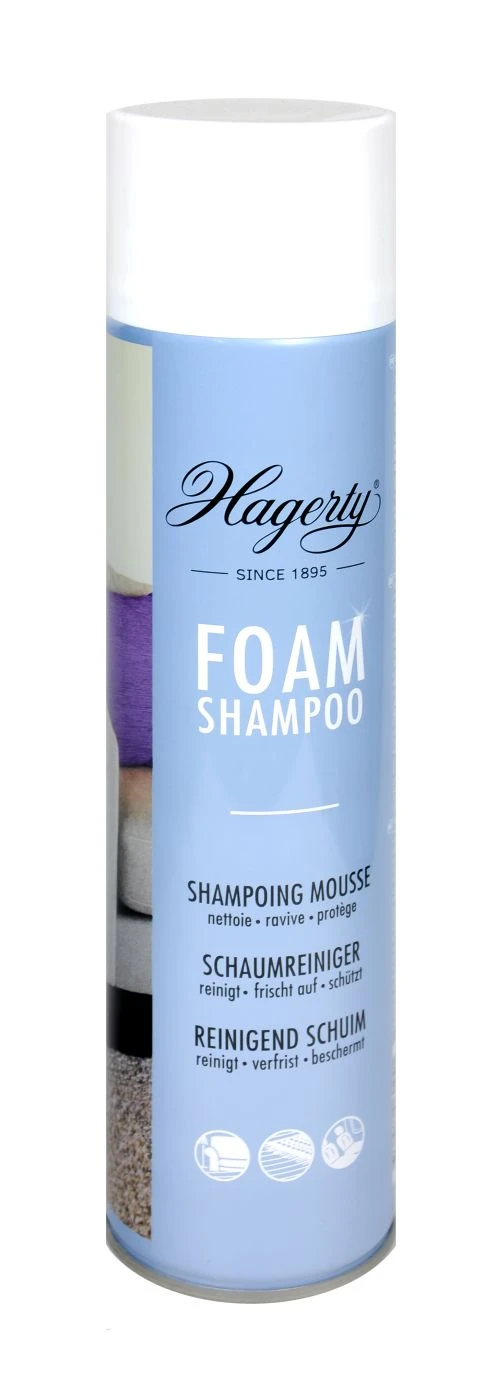 Hagerty Foam Shampoo Schaumreiniger befreit Textilgegenstände von hartnäckigen Flecken. Der Reiniger wird für die Anwendung auf den Fleck gesprüht und mit einem Schwamm einmassiert. Anschließend lässt man den Schaum trocknen, bis er weggebürstet werden kann und der Fleck verschwunden ist.