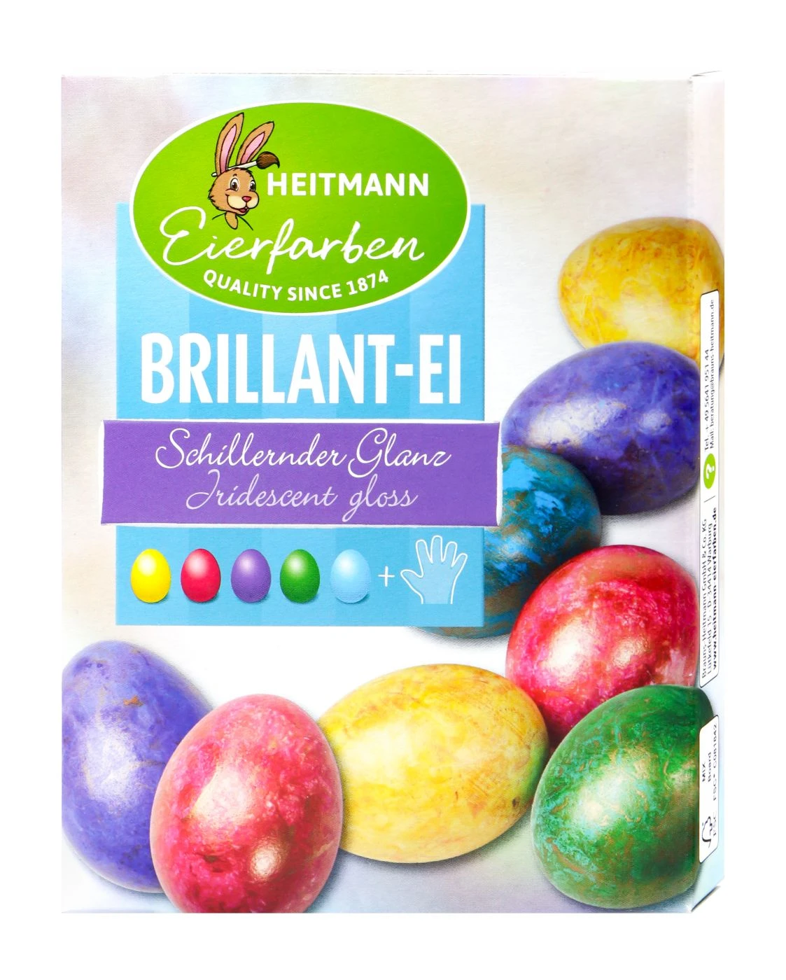 Heitmann Eierfarben Brilliant-Ei sind zur Osterzeit heiß begehrt. Ein Päckchen enthält fünf verschiedene Eierfarben (gelb, rot, violett, blau, grün), neben den Farben ist im Set noch der Brilliantglanz, Gummihandschuhe und Gummihandschuhe für Kinder enthalten.