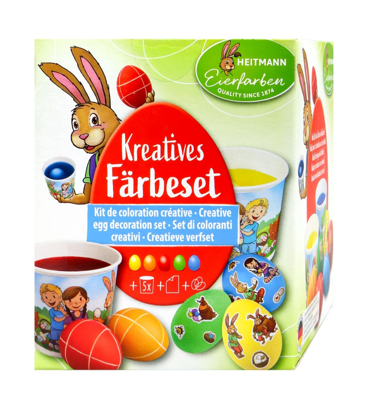 Das Heitmann Eierfarben Kreatives Färbeset mit 5 Kaltfarben(Gelb, Orange, Rot, Grün, Blau) ist ideal für das eierfärben mit Kindern geeignet. Neben dem Farben sind in dem Set ein Stickerbogen, fünf Färbebecher und Gummibänder enthalten.