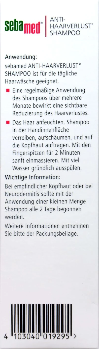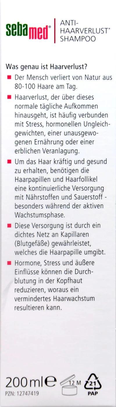 Das Sebamed Anti-Haarverlust Shampoo ist ein Produkt für die Haarpflege. Mit der einzigartigen NHE-Pflegeformel wird erblich bedingtem Haarausfall vorgebeugt. Die Formel und die Zusätze Coffein und Ginkgo Biloba sorgen für eine geförderte Durchblutung der Haare.