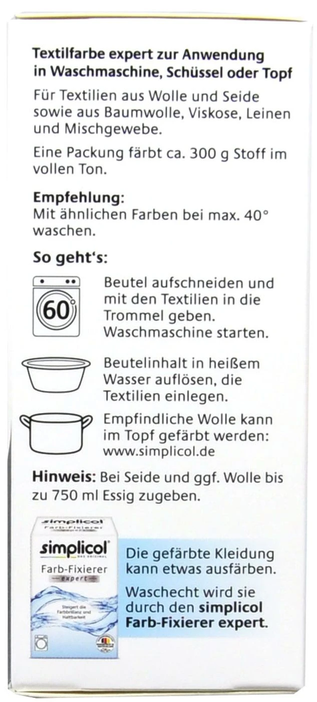 Simplicol Textilfarbe Expert in stilvollem Brombeer-Rot ermöglicht kreatives, einfaches Färben mit einem überzeugenden Farbergebnis. Für ein besonderes Gefühl durch besondere Farbe. Kleidung und Stoffe können ganz einfach neu gefärbt, aufgefrischt oder umgefärbt werden. Die Textilfarbe färbt einfach und sicher in der Waschmaschine oder per Hand. Sie eignet sich auch sehr gut für Wolle und Seide.