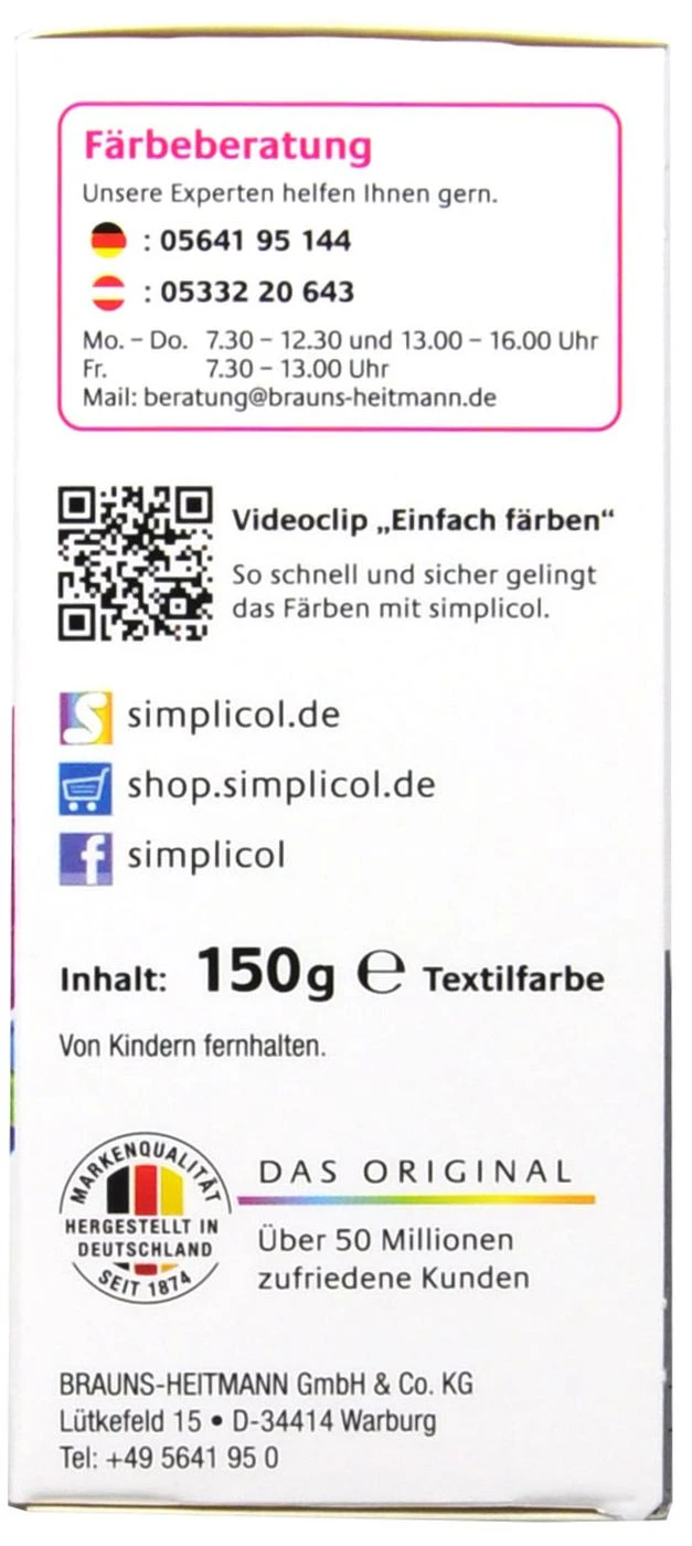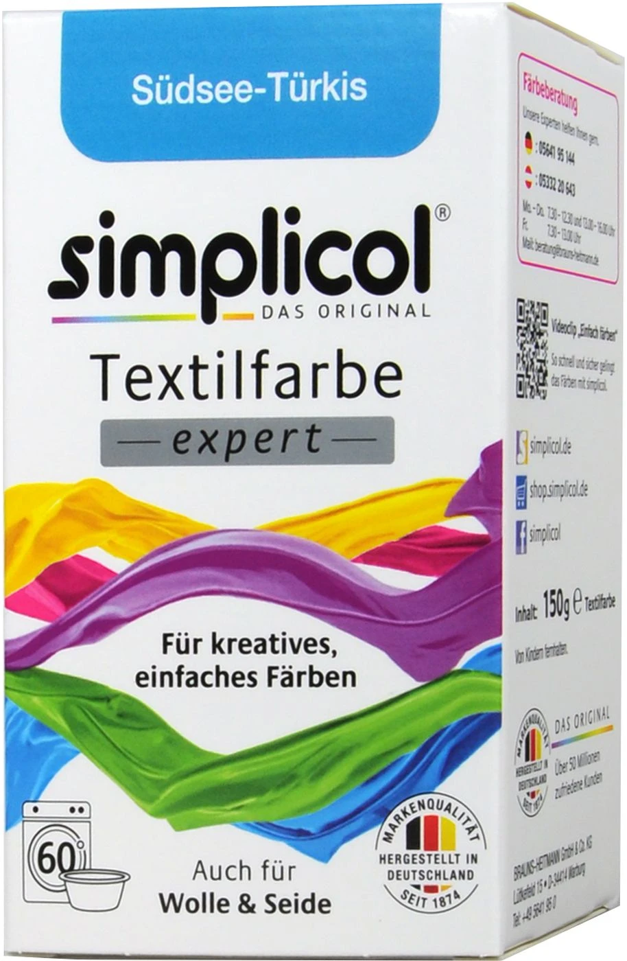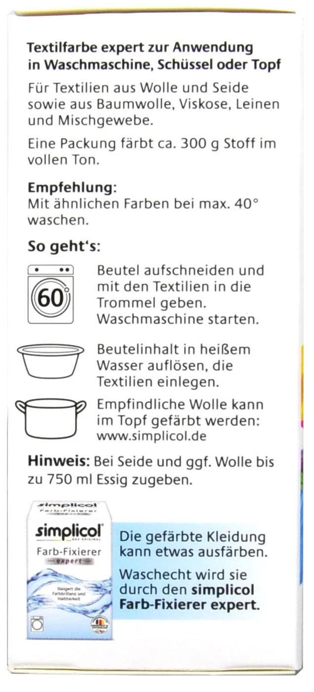 Simplicol Textilfarbe Expert in stilvollem Südsee-Türkis ermöglicht kreatives, einfaches Färben mit einem überzeugenden Farbergebnis. Für ein besonderes Gefühl durch besondere Farbe. Kleidung und Stoffe können ganz einfach neu gefärbt, aufgefrischt oder umgefärbt werden. Die Textilfarbe färbt einfach und sicher in der Waschmaschine oder per Hand. Sie eignet sich auch sehr gut für Wolle und Seide.