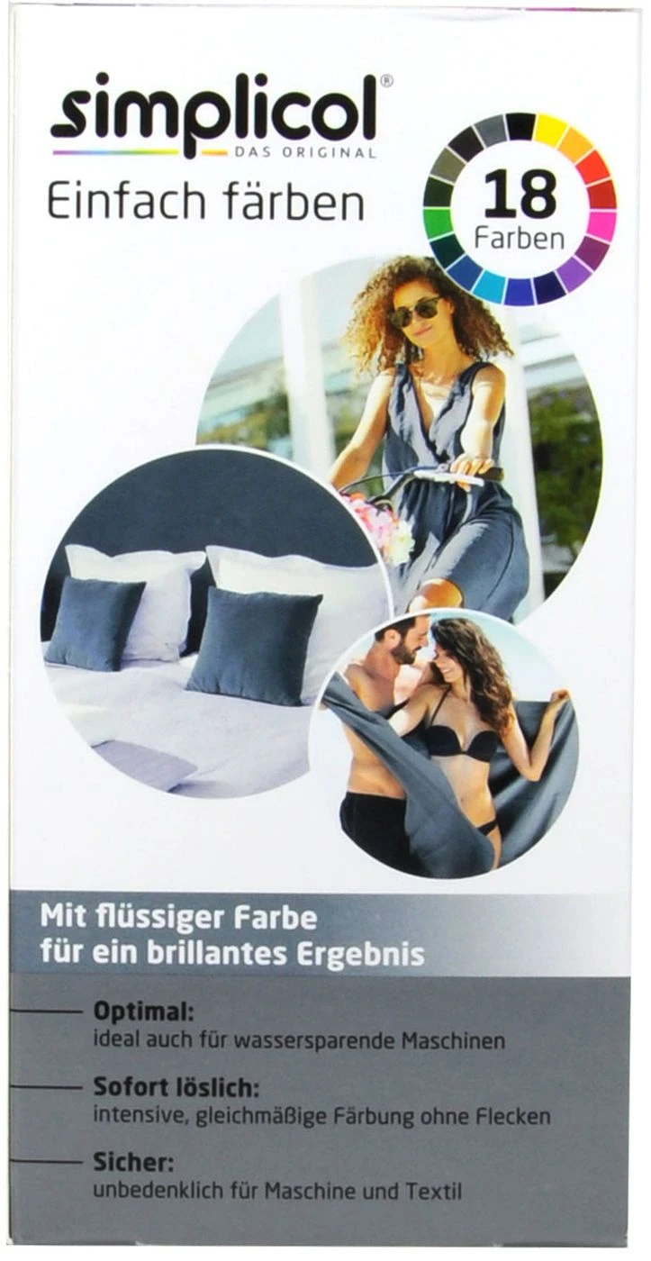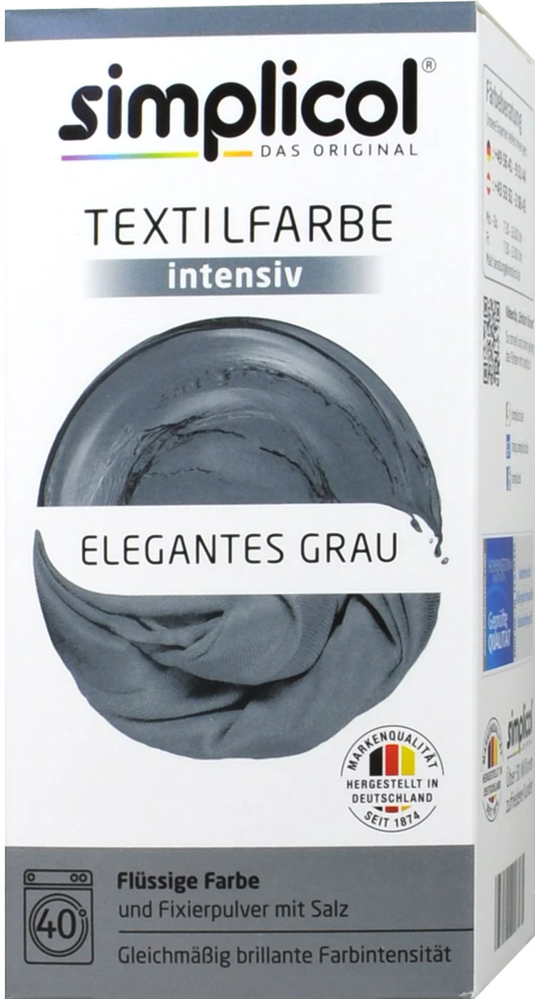 Simplicol Textilfarbe Intensiv in stilvollem Elegantes-Grau Farbton überzeugt durch ein perfektes farbintensives Ergebnis. Die Farbe lässt sich immer wieder neu kombinieren und passt je nach Vorliebe ideal zu allen Textilien. Für die Färbung einfach eine Komplettpackung in der Waschmaschine mit den zu färbenden Textilien waschen. Die Textilfarbe dient zum Neufärben, Umfärben und Auffrischen.