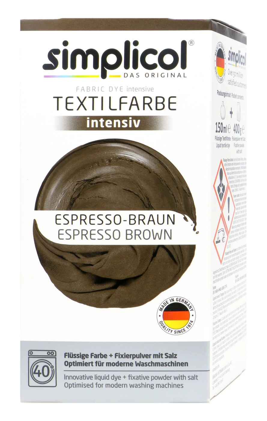 Simplicol Textilfarbe Intensiv in stilvollem Espresso-Braun Farbton überzeugt durch ein perfektes farbintensives Ergebnis. Die Farbe lässt sich immer wieder neu kombinieren und passt je nach Vorliebe ideal zu allen Textilien. Für die Färbung einfach eine Komplettpackung in der Waschmaschine mit den zu färbenden Textilien waschen. Die Textilfarbe dient zum Neufärben, Umfärben und Auffrischen.
