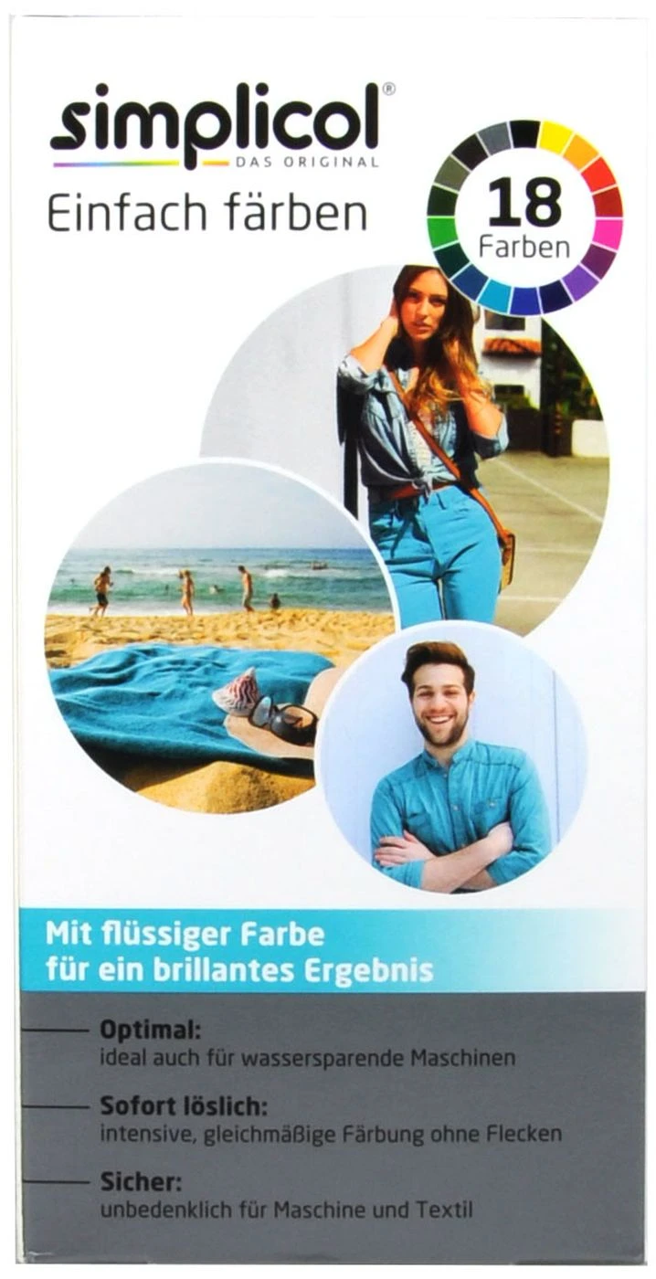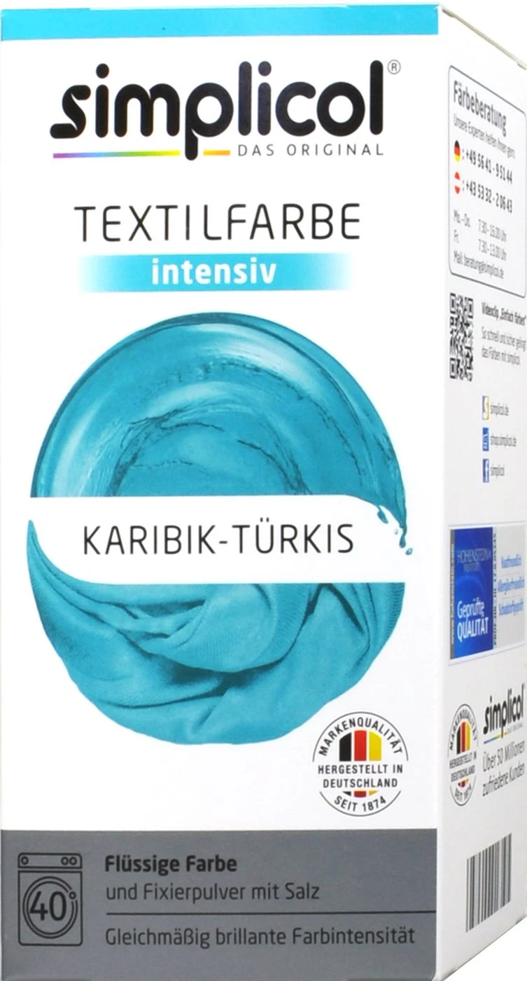 Simplicol Textilfarbe Intensiv in stilvollem Karibik-Türkis Farbton überzeugt durch ein perfektes farbintensives Ergebnis. Die Farbe lässt sich immer wieder neu kombinieren und passt je nach Vorliebe ideal zu allen Textilien. Für die Färbung einfach eine Komplettpackung in der Waschmaschine mit den zu färbenden Textilien waschen. Die Textilfarbe dient zum Neufärben, Umfärben und Auffrischen.