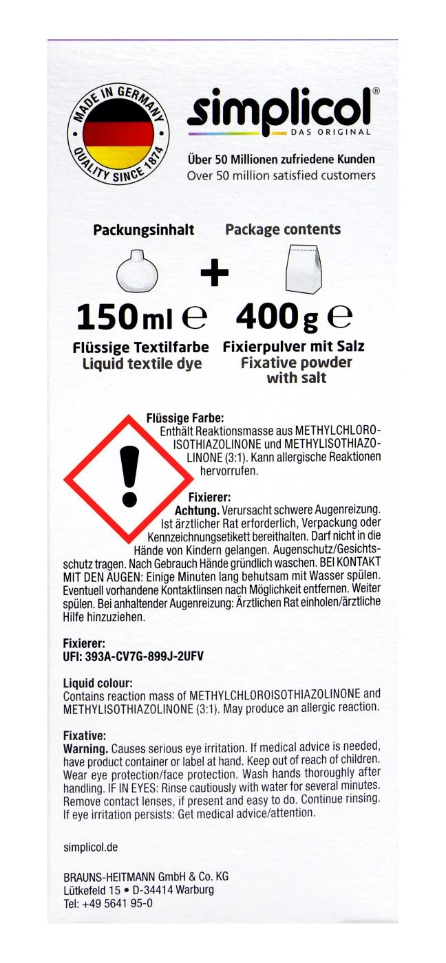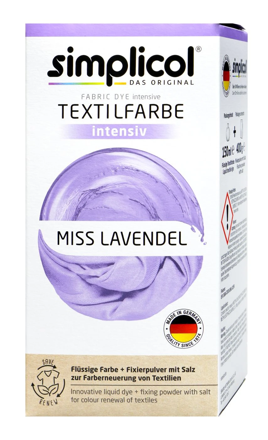 Simplicol Intensiv Miss Lavendel, 1027249, ist eine Textilfarbe zur Anwendung in der Waschmaschine. Ideal für Textilien aus Baumwolle, Viskose, Leinen und Mischgewebe. Nicht geeignet für Synthetics, Wolle und Seide.