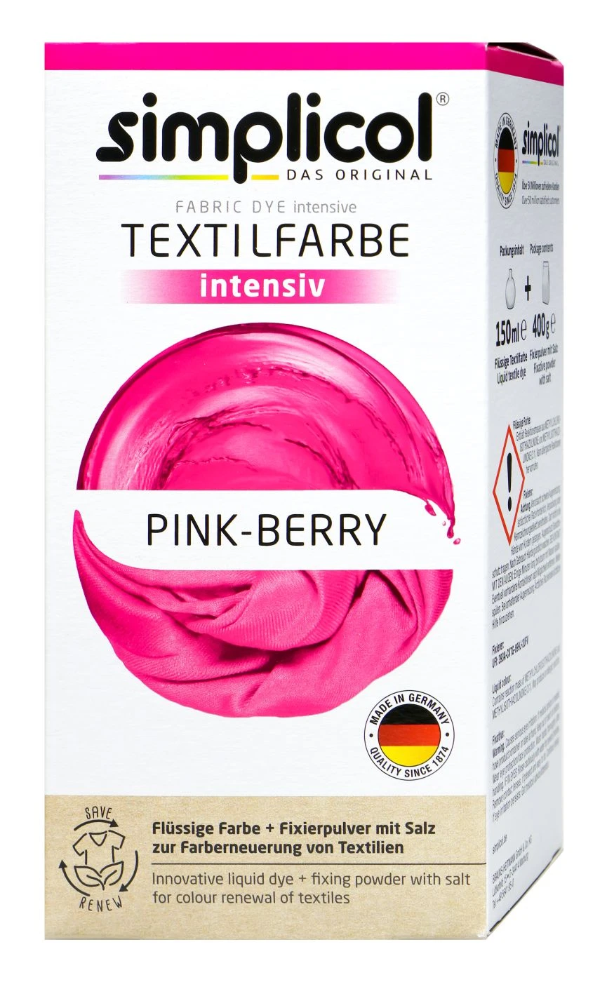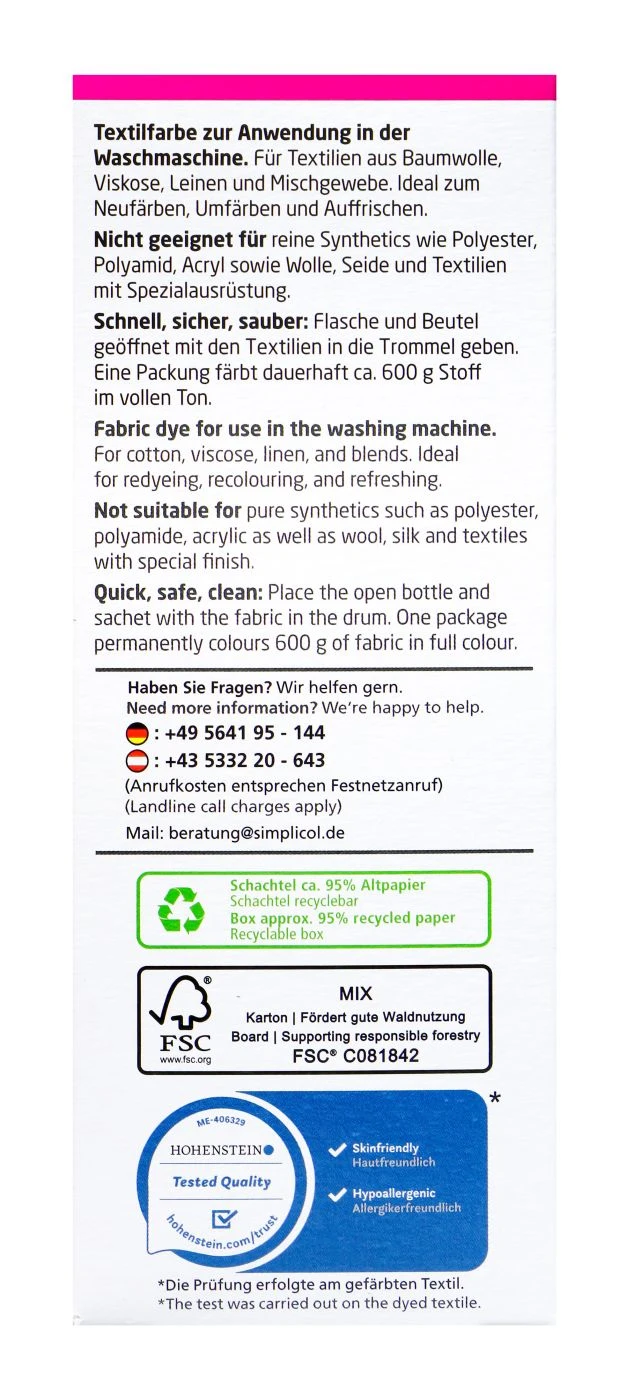 Simplicol Intensiv Pink-Berry, 1027620, ist eine Textilfarbe zur Anwendung in der Waschmaschine. Ideal für Textilien aus Baumwolle, Viskose, Leinen sowie Mischgewebe. Nicht geeignet für Synthetics, Wolle und Seide.