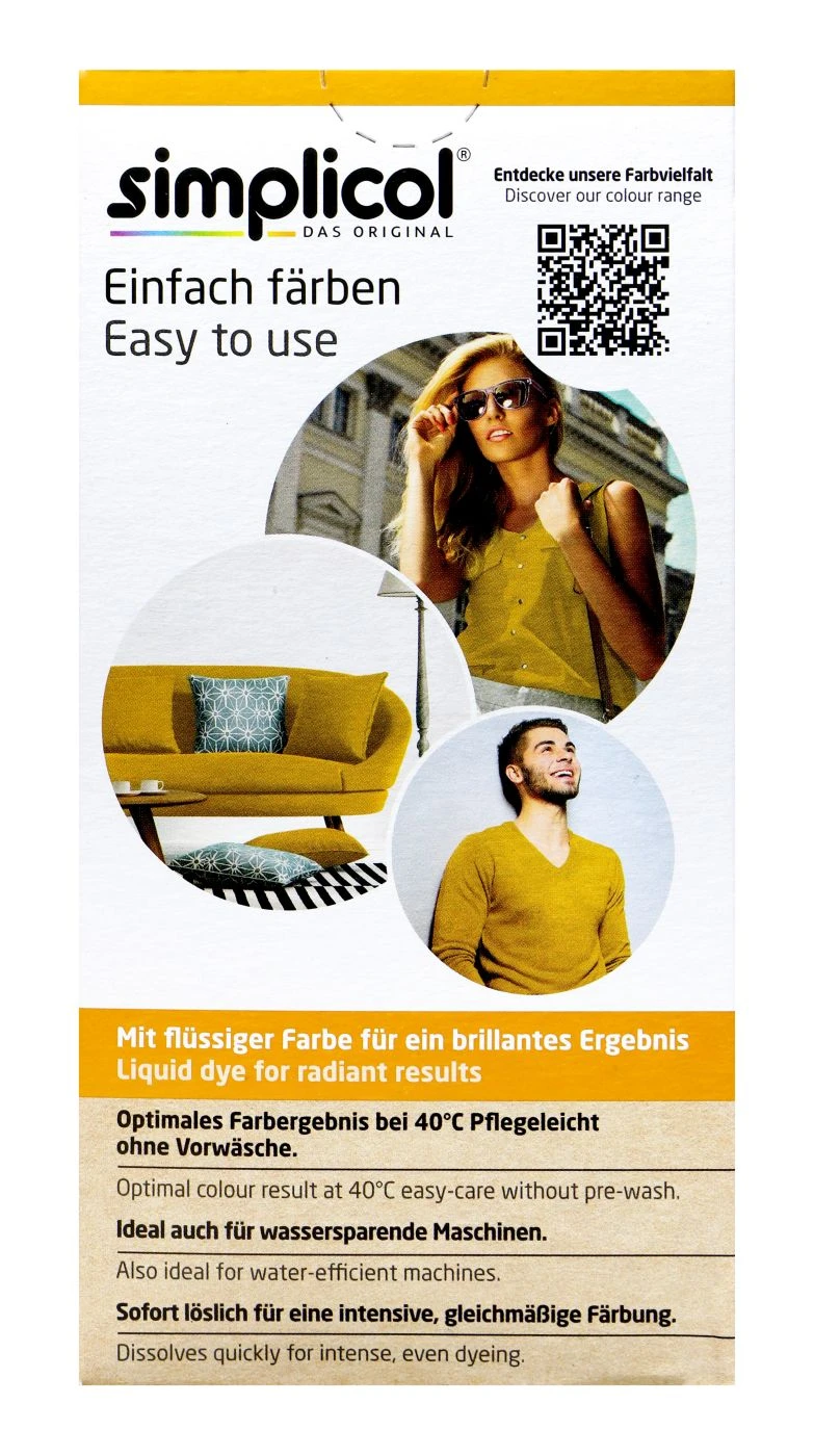Simplicol Intensiv Senf-Gelb, 7247 ist eine flüssigeTextilfarbe zur Farberneuerung von Textilien in der Waschmaschine. Zum Neu-/ Umfärben oder Auffrischen von Gewebe aus Baumwolle, Viskose, Leinen & Mischgewebe. Brilliante Farben schon bei 40° im Pflegeleicht-Programm.