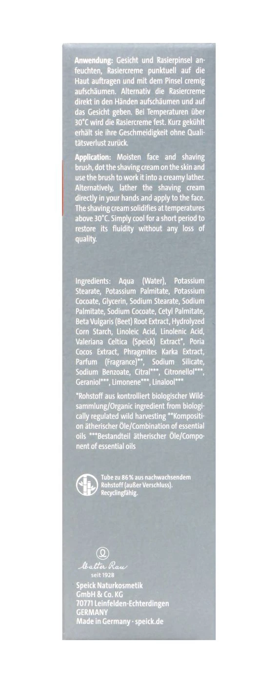 Und das Geheimnis? Speicks Rasiercreme auf Basis echter Seife, die sich perfekt aufschäumen lässt und die Rasierklinge sanft über die Haut gleiten lässt. Mit dem einzigartigen Extrakt der hochalpinen Speick-Pflanze aus kontrolliert biologischer Wildsammlung ist unsere Rasiercreme wie ein Hauch von Natur, der deine Haut verwöhnt und schützt, als wäre sie im Spa-Paradies.